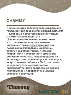 CHAMMY с говядиной - это сбалансированное и вкусное питание, изготовленное с использованием ингредиентов высокого качества для поддержания здоровья и жизненной энергии Вашего питомца.