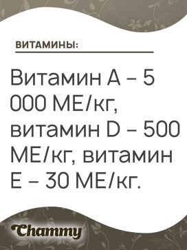 Витамин А – 5 000 МЕ/кг, витамин D – 500 МЕ/кг, витамин E – 30 МЕ/кг.