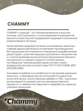 CHAMMY с курицей - это сбалансированное и вкусное питание, изготовленное с использованием ингредиентов высокого качества для поддержания здоровья и жизненной энергии Вашего питомца.