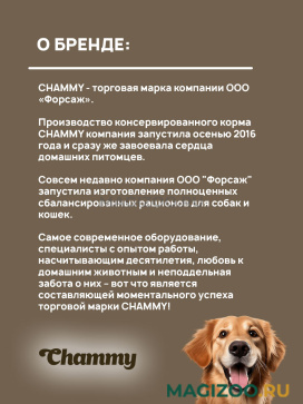 Информация о составе и ингредиентах, цветовом решении, технических и иных характеристиках, стране-изготовителе, внешнем виде и комплекте поставки товара носит справочный характер и основана на последних доступных к моменту публикации сведениях. Доставка данного товара осуществляется во все регионы РФ.Производство консервированного корма CHAMMY компания запустила осенью 2016 года и сразу же завоевала сердца домашних питомцев.