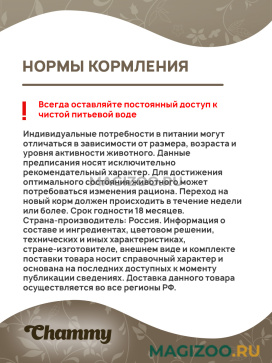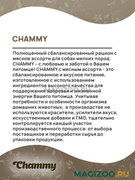 CHAMMY с мясным ассорти - это сбалансированное и вкусное питание, изготовленное с использованием ингредиентов высокого качества для поддержания здоровья и жизненной энергии Вашего питомца.