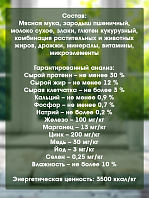 Мясная мука, зародыш пшеничный, молоко сухое, злаки, глютен кукурузный, комбинация растительных и животных жиров, дрожжи, минералы, витамины, микроэлементы.