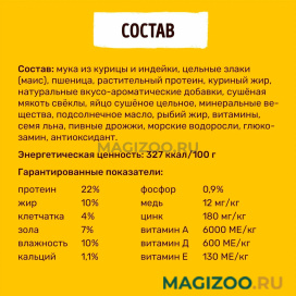 Состав: мука из курицы и индейки, цельные злаки (маис), пшеница, растительный протеин, куриный жир, натуральные вкусо-ароматические добавки, сушёная мякоть свёклы, яйцо сушеное цельное, минеральные вещества, подсолнечное масло, рыбий жир, витамины, семя льна, пивные дрожжи, морские водоросли, глюкозамин, антиоксидант.