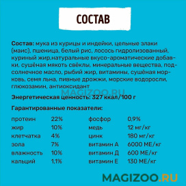 Состав: мука из курицы и индейки, цельные злаки (маис), пшеница, белый рис, лосось гидролизованный, куриный жир, натуральные вкусо-ароматические добавки, сушёная мякоть свёклы, минеральные вещества, рыбий жир, витамины, сушёная морковь, семя льна, пивные дрожжи, морские водоросли, глюкозамин, антиоксидант.