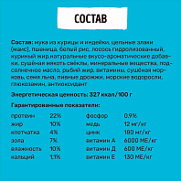 Мука из курицы и индейки, цельные злаки (маис), пшеница, белый рис, куриный жир, гидролизованное мясо индейки, натуральные вкусо-ароматические добавки, отруби, сушёная мякоть свёклы, минеральные вещества, рыбий жир, витамины, семя льна, пивные дрожжи, куркума, глюкозамин, антиоксидант.
