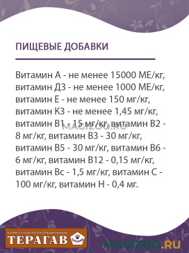 Информация о составе и ингредиентах, цветовом решении, технических и иных характеристиках, стране-изготовителе, внешнем виде и комплекте поставки товара носит справочный характер и основана на последних доступных к моменту публикации сведениях. Доставка данного товара осуществляется во все регионы РФ.С января 2021 года, уже полюбившиеся всем корма начали выпускаться под новым брендом «Терагав», но состав, упаковка и качество остались неизменными. Улучшенная рецептура, знакомый вкус и лояльная ценовая политика – на радость питомцам, и их хозяевам!