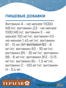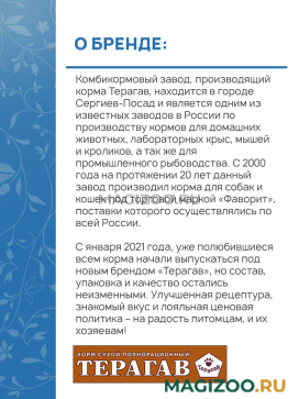 Информация о составе и ингредиентах, цветовом решении, технических и иных характеристиках, стране-изготовителе, внешнем виде и комплекте поставки товара носит справочный характер и основана на последних доступных к моменту публикации сведениях. Доставка данного товара осуществляется во все регионы РФ.С января 2021 года, уже полюбившиеся всем корма начали выпускаться под новым брендом «Терагав», но состав, упаковка и качество остались неизменными. Улучшенная рецептура, знакомый вкус и лояльная ценовая политика – на радость питомцам, и их хозяевам!