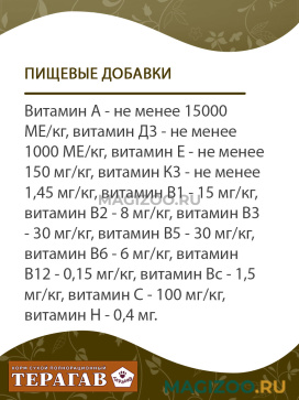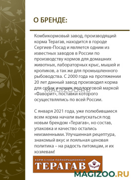 Информация о составе и ингредиентах, цветовом решении, технических и иных характеристиках, стране-изготовителе, внешнем виде и комплекте поставки товара носит справочный характер и основана на последних доступных к моменту публикации сведениях. Доставка данного товара осуществляется во все регионы РФ.С января 2021 года, уже полюбившиеся всем корма начали выпускаться под новым брендом «Терагав», но состав, упаковка и качество остались неизменными. Улучшенная рецептура, знакомый вкус и лояльная ценовая политика – на радость питомцам, и их хозяевам!