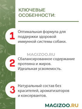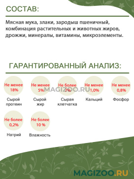 Состав: мясная мука, злаки, зародыш пшеничный, комбинация растительных и животных жиров, дрожжи, минералы, витамины, микроэлементы.