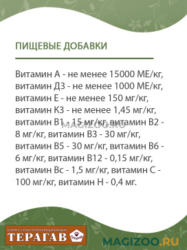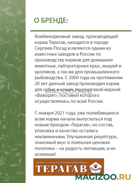 Информация о составе и ингредиентах, цветовом решении, технических и иных характеристиках, стране-изготовителе, внешнем виде и комплекте поставки товара носит справочный характер и основана на последних доступных к моменту публикации сведениях. Доставка данного товара осуществляется во все регионы РФ.С января 2021 года, уже полюбившиеся всем корма начали выпускаться под новым брендом «Терагав», но состав, упаковка и качество остались неизменными. Улучшенная рецептура, знакомый вкус и лояльная ценовая политика – на радость питомцам, и их хозяевам!