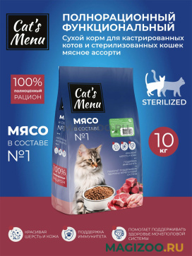 Сухой корм Cat’s menu (Кэтс меню) для кастрированных котов и стерилизованных кошек мясное рагу является полнорационным и функциональным кормом.