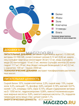 Питательные добавки в кг: витамин A (ретинола ацетат) 15 000 МЕ, витамин D3 900 МЕ, селен (селенит натрия 0,12 мг) 0,06 мг, марганец (сульфат марганца моногидрат 36 мг) 12 мг, медь (сульфата меди (II) пентагидрат 18 мг) 5 мг, железо (сульфат железа (II) моногидрат 117 мг) 39 мг, йод (йодат кальция безводный 3,4 мг) 2,2 мг, L-карнитин: 100 мг, таурин 2000 мг.