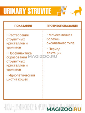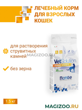 Лечебный корм Monge VetSolution Cat Urinary Struvite Уринари Струвит для кошек при заболеваниях мочеполовой системы, таких как идиопатический цистит (синдром болезненного мочевого пузыря, интерстициальный цистит) и струвитное течение мочекаменной болезни (струвитная кристаллурия и уролитиаз).