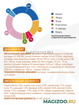 Питательные добавки в кг: витамин A (ретинола ацетат) 16 000 МЕ, витамин D3 900 МЕ, селен (селенит натрия 0,25 мг) 0,11 мг, марганец (сульфат марганца моногидрат 72 мг) 23 мг, медь (сульфат меди (II) пентагидрат 36 мг): 9 мг, железо (сульфат железа (II) моногидрат 234 мг) 77 мг, йод (йодат кальция безводный 6.8 мг): 4.45 мг, технически очищенный DL-метионин: 2000 мг, L карнитин: 100 мг, таурин 2500 мг.