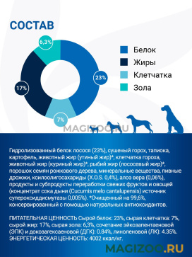 Состав: гидролизованный белок лосося (23%), сушеный горох, тапиока, картофель, животный жир (утиный жир)*, клетчатка гороха, животный жир (куриный жир)*, рыбий жир (лососевый жир)*, порошок семян рожкового дерева, минеральные вещества, пивные дрожжи, ксилоолигосахариды (XOS 0,4%), алоэ вера (0,06%), продукты и субпродукты переработки свежих фруктов и овощей (концентрат сока дыни (Cucumis melo cantalupensis) источник супероксиддисмутазы 0,005%).