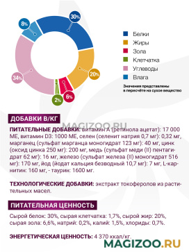 Питательные добавки: витамин А (ретинола ацетат): 17 000 МЕ, витамин D3: 1000 МЕ, селен (селенит натрия 0,36 мг): 0,17 мг, марганец (сульфат марганца моногидрат 105 мг): 34 мг, медь (сульфат меди (II) пентагидрат 53 мг): 13.5 мг, железо (сульфат железа (II) моногидрат 343 мг): 112,8 мг, йод (йодат кальция безводный 10 мг): 6.5 мг, L-карнитин: 160 мг, - таурин: 1600 мг.