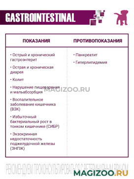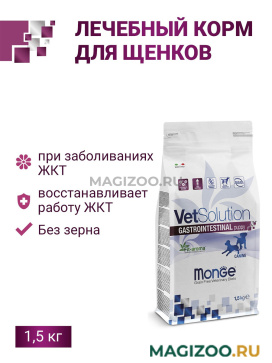 Лечебный корм Monge VetSolution Dog Gastrointestinal для собак Гастроинтестинал при заболеваниях желудочно-кишечного тракта, таких как острый и хронический гастрит, расстройства моторики желудка энтерит и воспалительные заболевания кишечника, энтеропатии с потерей белка, синдром короткой кишки и избыточный бактериальный рост в тонком отделе кишечника, колит, а так же при остром и хроническом панкреатите (для собак, НЕ страдающих ожирением и гипертриглицеридемией).