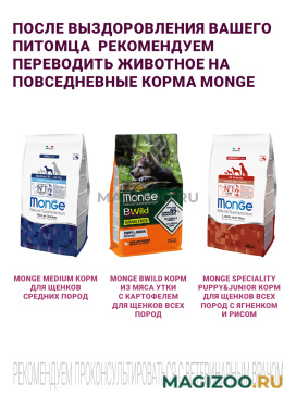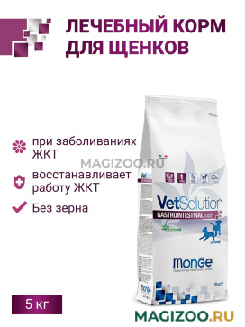Лечебный корм Monge VetSolution Dog Gastrointestinal для собак Гастроинтестинал при заболеваниях желудочно-кишечного тракта, таких как острый и хронический гастрит, расстройства моторики желудка энтерит и воспалительные заболевания кишечника, энтеропатии с потерей белка, синдром короткой кишки и избыточный бактериальный рост в тонком отделе кишечника, колит, а так же при остром и хроническом панкреатите (для собак, НЕ страдающих ожирением и гипертриглицеридемией).