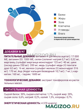 Питательные добавки: витамин А (ретинола ацетат): 17 000 МЕ, витамин D3: 1000 МЕ, селен (селенит натрия 0,36 мг): 0,17 мг, марганец (сульфат марганца моногидрат 105 мг): 34 мг, медь (сульфат меди (II) пентагидрат 53 мг): 13.5 мг, железо (сульфат железа (II) моногидрат 343 мг): 112,8 мг, йод (йодат кальция безводный 10 мг): 6.5 мг, L-карнитин: 160 мг, - таурин: 1600 мг.