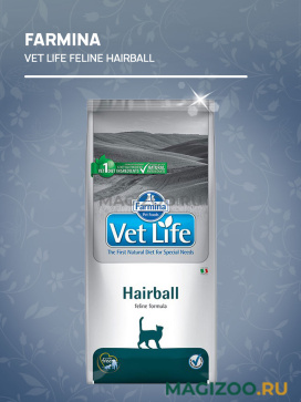 FARMINA VET LIFE FELINE HAIRBALL — полнорационный диетический сухой корм для кошек, способствующий выведению комочков шерсти из кишечника.