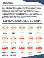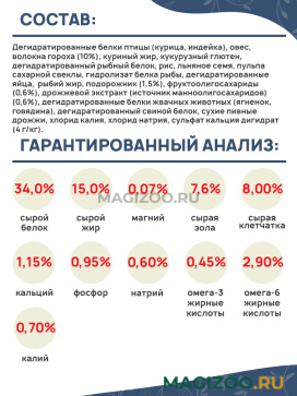 Дегидратированные белки птицы (курица, индейка), овес, волокна гороха (10%), куриный жир, кукурузный глютен, дегидратированный рыбный белок, рис, льняное семя, пульпа сахарной свеклы, гидролизат белка рыбы, дегидратированные яйца, рыбий жир, подорожник (1,5%), фруктоолигосахариды (0,6%), дрожжевой экстракт (источник манноолигосахаридов) (0,6%), дегидратированные белки жвачных животных (ягненок, говядина), дегидратированный свиной белок, сухие пивные дрожжи, хлорид калия, хлорид натрия, сульфат кальция дигидрат (4 г/кг).