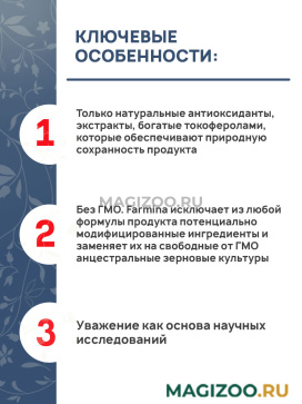 - Все продукты Farmina разработаны специалистами и протестированы на собаках и кошках в домашних условиях содержания.