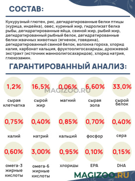 Кукурузный глютен, рис, дегидратированные белки птицы (курица, индейка), овес, куриный жир, гидролизат белка рыбы, дегидратированные яйца, свиной жир, рыбий жир, дегидратированный рыбный белок, дегидратированные белки жвачных животных (ягненок, говядина), дегидратированный свиной белок, волокна гороха, хлорид калия, карбонат кальция, фруктоолигосахариды, дрожжевой экстракт (источник манноолигосахаридов), хлорид натрия, глюкозамин.