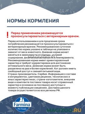 Информация о составе и ингредиентах, цветовом решении, технических и иных характеристиках, стране-изготовителе, внешнем виде и комплекте поставки товара носит справочный характер и основана на последних доступных к моменту публикации сведениях. Доставка данного товара осуществляется во все регионы РФ.Продукция FARMINA является современным стандартом безупречного качества корма. Натуральные компоненты, минеральные вещества, витамины позволяют создавать сбалансированное питание по оптимальной цене. Продукция изготавливается из сырья итальянского, французского и датского производства. FARMINA производит свою продукцию на трех собственных фабриках, которые расположены в трех странах: Италия, Бразилия и Сербия.