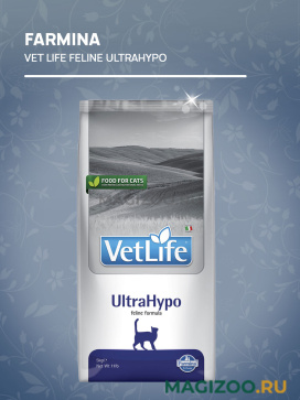 FARMINA VET LIFE FELINE ULTRAHYPO — полнорационный сбалансированный сухой корм для взрослых кошек при неблагоприятной реакции на пищу (пищевая аллергия и/или пищевая непереносимость). Может быть использован в качестве диагностического теста (исключающая диета). Рекомендован в качестве диетотерапии при хронических воспалительных заболеваниях кишечника (IBD), рецидивирующей рвоте.