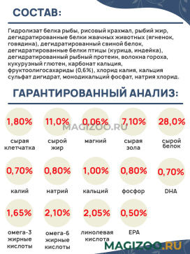 Гидролизат белка рыбы, рисовый крахмал, рыбий жир, дегидратированные белки жвачных животных (ягненок, говядина), дегидратированный свиной белок, дегидратированные белки птицы (курица, индейка), дегидратированный рыбный протеин, волокна гороха, кукурузный глютен, карбонат кальция, фруктоолигосахариды (0,6%), хлорид калия, кальция сульфат дигидрат, монодикальций фосфат, натрия хлорид.