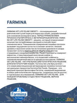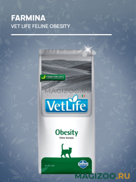 FARMINA VET LIFE FELINE OBESITY — полнорационный диетический сухой корм для взрослых кошек, разработанный для снижения излишнего веса.
