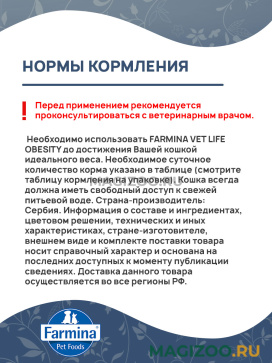 Перед использованием необходимо проконсультироваться с ветеринарным врачом. Необходимо использовать FARMINA VET LIFE OBESITY до достижения Вашей кошкой идеального веса. Необходимое суточное количество корма указано в таблице (смотрите таблицу кормления на упаковке). Кошка всегда должна иметь свободный доступ к свежей питьевой воде.