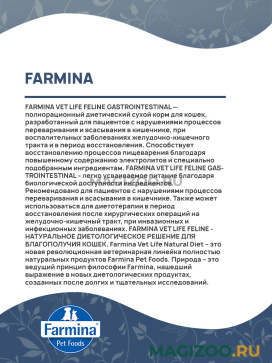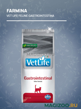 FARMINA VET LIFE FELINE GASTROINTESTINAL — полнорационный диетический сухой корм для кошек, разработанный для пациентов с нарушениями процессов переваривания и всасывания в кишечнике, при воспалительных заболеваниях желудочно-кишечного тракта и в период восстановления. Способствует восстановлению процессов пищеварения благодаря повышенному содержанию электролитов и специально подобранным ингредиентам.