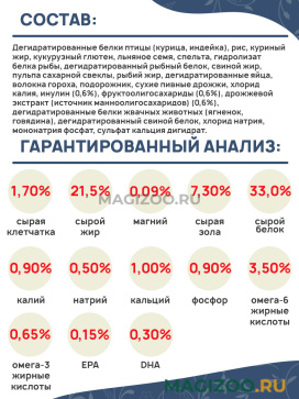 Дегидратированные белки птицы (курица, индейка), рис, куриный жир, кукурузный глютен, льняное семя, спельта, гидролизат белка рыбы, дегидратированный рыбный белок, свиной жир, пульпа сахарной свеклы, рыбий жир, дегидратированные яйца, волокна гороха, подорожник, сухие пивные дрожжи, хлорид калия, инулин (0,6%), фруктоолигосахариды (0,6%), дрожжевой экстракт (источник манноолигосахаридов) (0,6%), дегидратированные белки жвачных животных (ягненок, говядина), дегидратированный свиной белок, хлорид натрия, мононатрия фосфат, сульфат кальция дигидрат.
