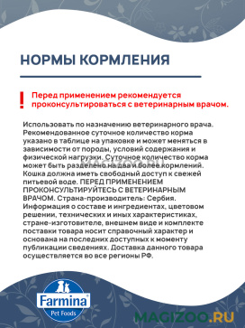 Информация о составе и ингредиентах, цветовом решении, технических и иных характеристиках, стране-изготовителе, внешнем виде и комплекте поставки товара носит справочный характер и основана на последних доступных к моменту публикации сведениях. Доставка данного товара осуществляется во все регионы РФ.Продукция FARMINA является современным стандартом безупречного качества корма. Натуральные компоненты, минеральные вещества, витамины позволяют создавать сбалансированное питание по оптимальной цене. Продукция изготавливается из сырья итальянского, французского и датского производства. FARMINA производит свою продукцию на трех собственных фабриках, которые расположены в трех странах: Италия, Бразилия и Сербия.