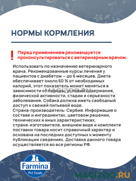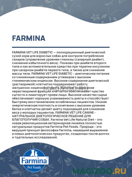 FARMINA VET LIFE DIABETIC — полнорационный диетический сухой корм для взрослых собак для контроля потребления сахаров (управление уровнем глюкозы (сахарный диабет), снижение избыточного веса). Показан при диабете второго типа и как вспомогательное средство при терапии инсулином при сахарном диабете первого типа, а также для снижения массы тела.