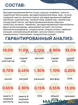 Дегидратированные белки птицы (курица, индейка), спельта, гидролизат белка рыбы, дегидратированные яйца, овес, пульпа сахарной свеклы, волокна гороха, дегидратированный рыбный протеинe, куриный жир, льняное семя, рыбий жир, свиной жир, кукурузный глютен, дегидратированные белки жвачных животных (ягненок, говядина), дегидратированный свиной белок, фруктоолигосахариды, дрожжевой экстракт (источник манноолигосахаридов), хлорид калия, хлорид натрия, карбонат кальция, монодикальций фосфат, шелуха семян и семена подорожника, глюкозамин, хондроитина сульфат.