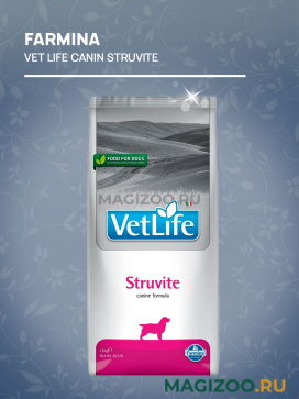 FARMINA VET LIFE CANIN STRUVITE — рацион, введение в рецептуру которого сульфата кальция создает и поддерживает оптимальный рН мочи для подавления образования и растворения струвитов. Состав корма создает неблагоприятные условия для бактериальной пролиферации. Низкая концентрация белков, кальция, фосфора и магния создает неблагоприятную ситуацию для агрегации и кристаллизации осадков.