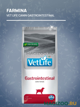 FARMINA VET LIFE GASTROINTESTINAL — диетический сухой корм для собак, рекомендуемый для лечения воспалительных заболеваний желудочно-кишечного тракта, синдрома нарушения всасывания и переваривания пищи, при экзокринной недостаточности поджелудочной железы. Также рекомендован для кормления собак в период реабилитации после хирургических вмешательств на органах пищеварения. Качество используемых ингредиентов обеспечивает высокую усваиваемость диеты.