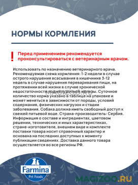 FARMINA VET LIFE GASTROINTESTINAL — высоко усвояемый рацион, который способствует восстановлению нормальной микрофлоры и защищает слизистую оболочку кишечника с помощью растворимой фракции клетчатки. Диета также рекомендована для собак с пониженной ферментативной активностью поджелудочной железы и при остром панкреатите на начальной стадии или когда животное начинает потреблять пищу. В период реабилитации после хирургических вмешательств на ЖКТ рекомендовано увеличить количество кормлений до 6 раз в день.