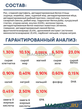 Рис, сладкий картофель, дегидратированные белки птицы (курица, индейка), овес, куриный жир, дегидратированные яйца, дегидратированный рыбный протеин, свиной жир, пульпа сахарной свеклы, рыбий жир, гидролизат белка рыбы, кукурузный глютен, хлорид калия, инулин (0,6%), волокна гороха, дегидратированные белки жвачных животных (ягненок, говядина), дегидратированный свиной белок, фруктоолигосахариды (0,4%), дрожжевой экстракт (источник манноолигосахаридов) (0,4%), карбонат кальция, хлорид натрия.
