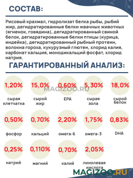 Рисовый крахмал, гидролизат белка рыбы, рыбий жир, дегидратированные белки жвачных животных (ягненок, говядина), дегидратированный свиной белок, дегидратированные белки птицы (курица, индейка), дегидратированный рыбный протеин, волокна гороха, кукурузный глютен, хлорид калия, карбонат кальция, монодикальций фосфат, хлорид натрия.