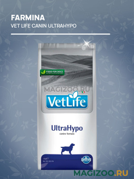 FARMINA VET LIFE CANIN ULTRAHYPO — диетический сухой корм для собак, разработанный для снижения пищевой непереносимости питательных веществ в случаях пищевой аллергии и атопий. Используется в качестве диагностического инструмента (исключающая диета). Диета также показана при атопических дерматитах и воспалительных состояниях кишечника.