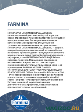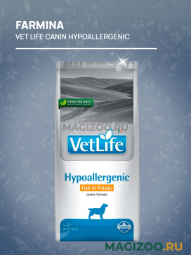 FARMINA VET LIFE CANIN HYPOALLERGENIC — гипоаллергенный диетический сухой корм для собак, страдающих пищевой аллергией или пищевой непереносимостью. Также рекомендован как вспомогательное средство для улучшения трофических функции кожи и ее производных.