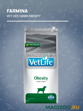FARMINA VET LIFE CANIN OBESITY — рацион, который ограничивает количество потребляемых калорий и способствует снижению веса. Повышенное содержание пищевых волокон вызывает ощущение сытости и снижает аппетит. Низкий уровень и высокое качество источников крахмала и сахара позволяет использовать диету в терапии пациентов страдающих сахарным диабетом. Рецептура диеты содержит карнитин, стимулирующий окисление жиров, и высококачественные белки, что позволяет избежать снижения мышечной массы в процессе похудения.
