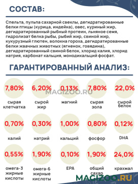 Спельта, пульпа сахарной свеклы, дегидратированные белки птицы (курица, индейка), овес, куриный жир, дегидратированный рыбный протеин, льняное семя, гидролизат белка рыбы, рыбий жир, свиной жир, кукурузный глютен, волокна гороха, дегидратированные белки жвачных животных (ягненок, говядина), дегидратированный свиной белок, хлорид калия, хлорид натрия, карбонат кальция, монодикальций фосфат.