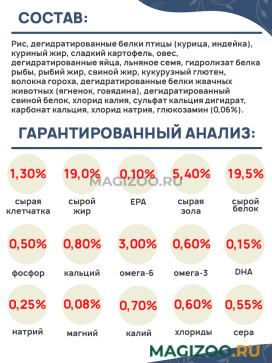 Рис, дегидратированные белки птицы (курица, индейка), куриный жир, сладкий картофель, овес, дегидратированные яйца, льняное семя, гидролизат белка рыбы, рыбий жир, свиной жир, кукурузный глютен, волокна гороха, дегидратированные белки жвачных животных (ягненок, говядина), дегидратированный свиной белок, хлорид калия, сульфат кальция дигидрат, карбонат кальция, хлорид натрия, глюкозамин (0,06%).
