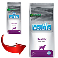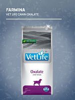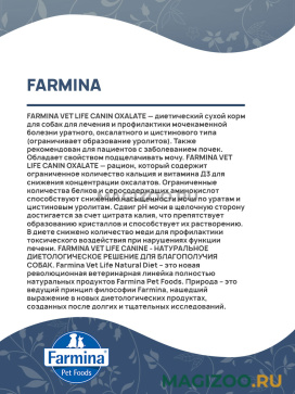 FARMINA VET LIFE CANIN OXALATE — диетический сухой корм для собак для лечения и профилактики мочекаменной болезни уратного, оксалатного и цистинового типа (ограничивает образование уролитов). Также рекомендован для пациентов с заболеванием почек. Обладает свойством подщелачивать мочу.
