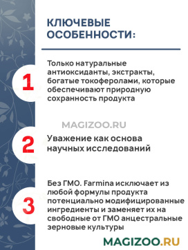 - Все продукты Farmina разработаны специалистами и протестированы на собаках и кошках в домашних условиях содержания.