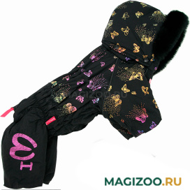 Теплый комбинезон для Вашего питомца из красивого полиэстер с металлизированным принтом "Бабочки" на гладком подкладке из синтепона. Удобно одевать и снимать.